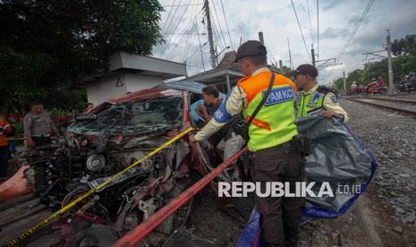 REPUBLIKA.CO.ID, SLEMAN -- Petugas mengamati mobil yang tertabrak kereta 161 Bangunkarta di perlintasan antara Stasiun Brambanan dan Maguwo, Prambanan, Sleman, D.I Yogyakarta, Selasa (4/11/2025).
