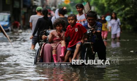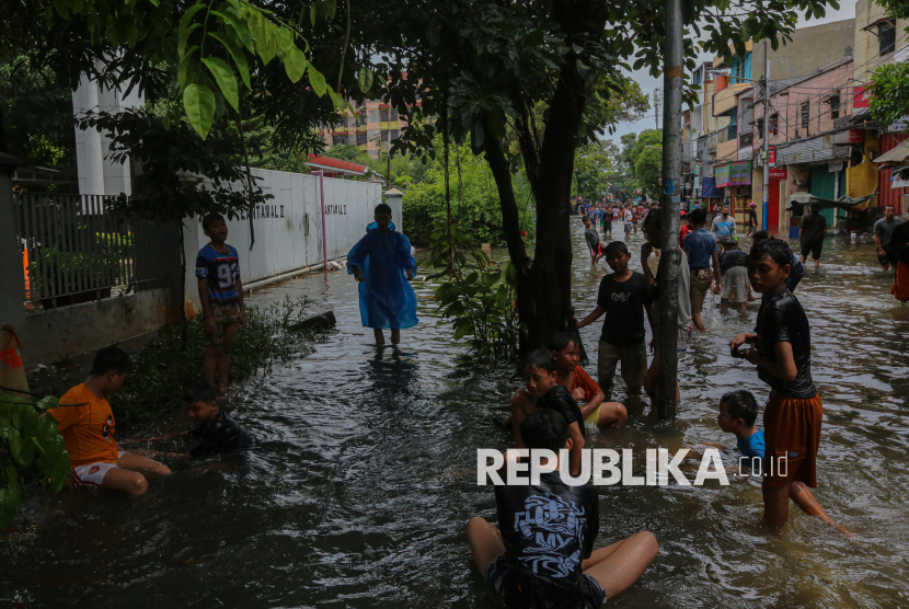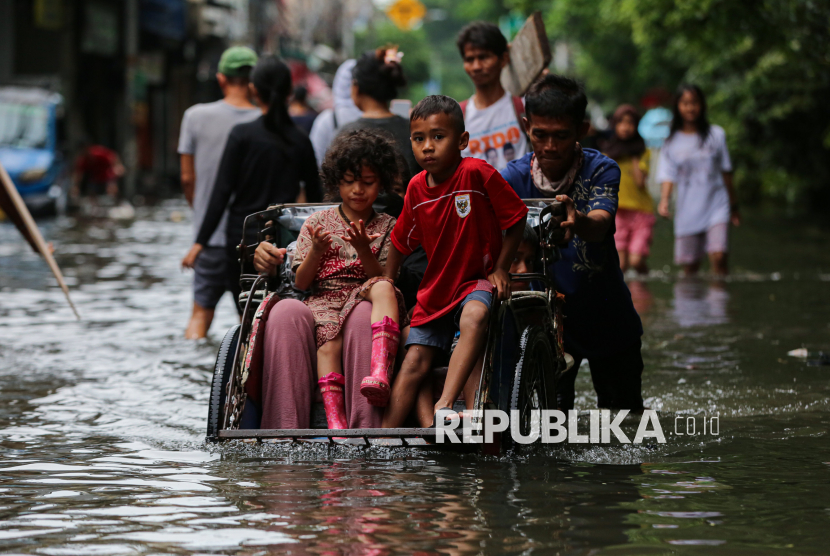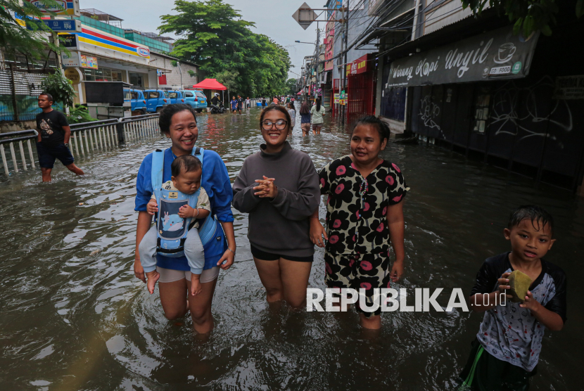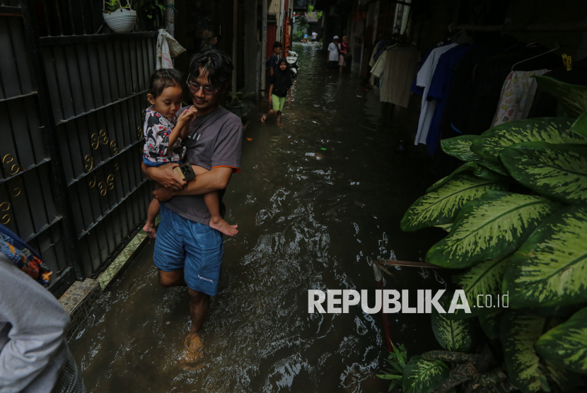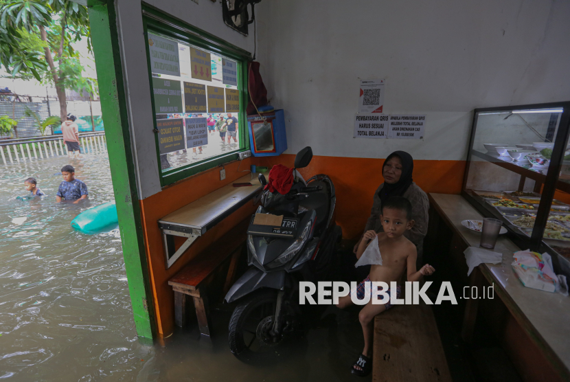 Warga beraktivitas saat banjir merendam kawasan permukiman di Pademangan Barat, Ancol, Jakarta Utara, Ahad (18/1/2026). Banjir setinggi sekitar 40-60 centimeter tersebut menggenangi permukiman di Pademangan Barat sejak pagi pukul 04.00 WIB yang disebabkan oleh intensitas hujan yang tinggi pada Sabtu (17/1) malam yang mengakibatkan luapan air dari kali Ancol, Kali Kwitang dan aliran drainase di kawasan tersebut. (FOTO : Republika/Thoudy Badai)