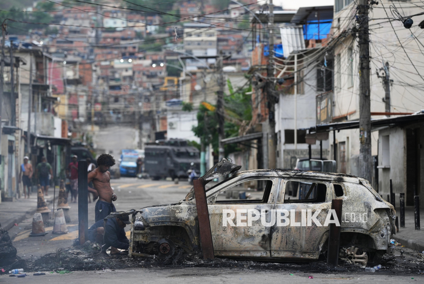 Sisa mobil yang terbakar yang digunakan sebagai barikade oleh terduga pengedar narkoba selama operasi polisi di favela Complexo do Alemao tempat organisasi kriminal Comando Vermelho beroperasi di Rio de Janeiro, Selasa (28/10/2025). Pemerintah Brasil melaporkan korban tewas dalam operasi penggerebekan bandar narkoba itu mencapai 64 orang, di mana 60 di antaranya diduga anggota geng narkoba, sementara 4 sisanya polisi. Operasi penggerebekan bandar narkoba itu disebut sebagai yang terbesar dalam sejarah negara bagian Rio de Janeiro. (FOTO : AP Photo/Silvia Izquierdo)