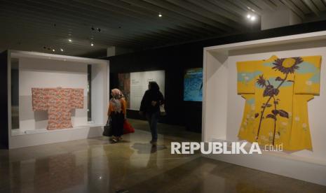 Pengunjung mengamati baju kimono pada pameran Jalinan Waktu: Pewarnaan dan Tenunan Wastra Indonesia dan Jepang (Threading Across Time: Dyeing and Weaving of Indonesia and Japan) di Museum Nasional Indonesia, Jakarta, Sabtu (29/11/2025). Pengunjung pameran diajak mengenal lebih jauh keindahan wastra tradisional dari dua negara yang kaya akan budaya: Indonesia dan Jepang. (FOTO : Republika/Prayogi)