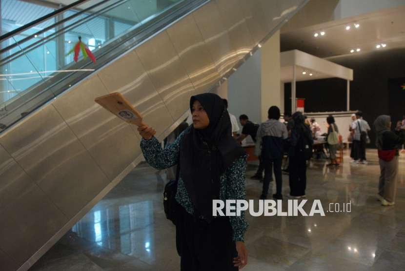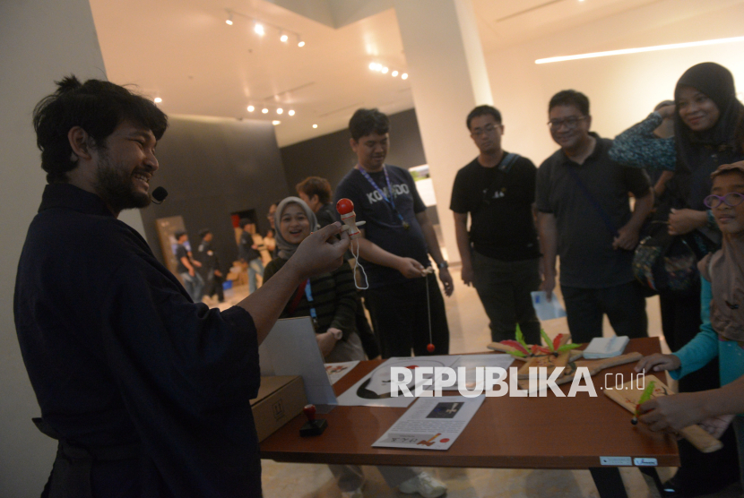 Pengunjung mencoba permainan tradisional jepang pada kegiatan Lets Try Experience of Being a Samurai di Museum Nasional Indonesia, Jakarta, Sabtu (29/11/2025). Kegiatan ini diselenggarakan dalam rangka menyukseskan pameran Jalinan Waktu: Pewarnaan dan Tenunan Wastra Indonesia dan Jepang (Threading Across Time: Dyeing and Weaving of Indonesia and Japan). (FOTO : Republika/Prayogi)