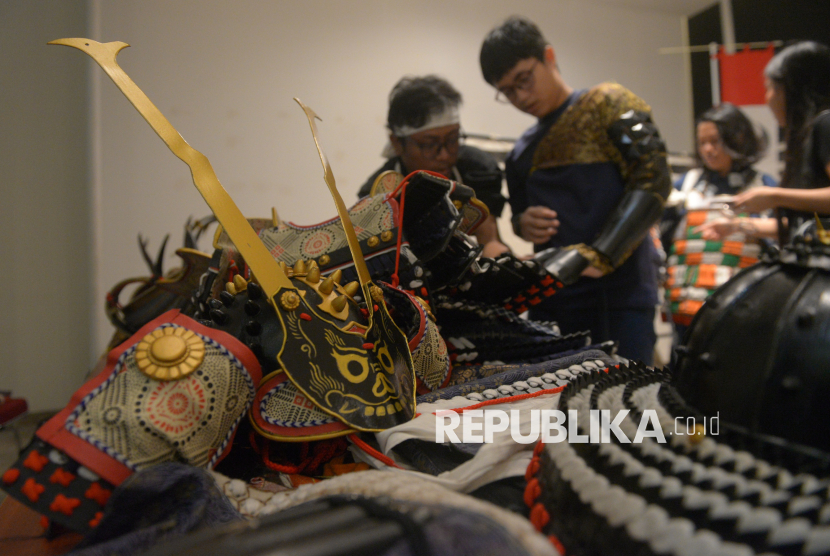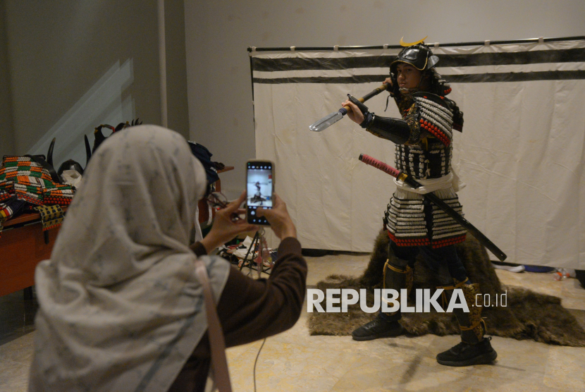 Pengunjung menggunakan baju zirah samurai pada kegiatan Lets Try Experience of Being a Samurai di Museum Nasional Indonesia, Jakarta, Sabtu (29/11/2025). Dalam kegiatan tersebut, pengunjung dapat merasakan pengalaman menjadi samurai melalui lokakarya yang menarik mengenai budaya Jepang, mulai dari mempelajari gerakan dasar katana, mencoba replika zirah, hingga memainkan permainan tradisional jepang. (FOTO : Republika/Prayogi)
