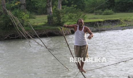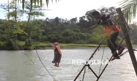 REPUBLIKA.CO.ID, ACEH -- Warga melintasi jembatan tali yang terbuat dari kabel listrik penghubung Desa Canggai dengan Desa Keutambang Kecamatan Pante Ceureumen, Aceh Barat, Aceh, Selasa (28/10/2025).