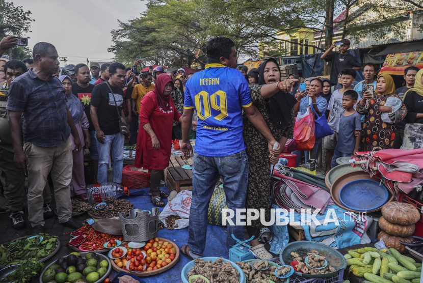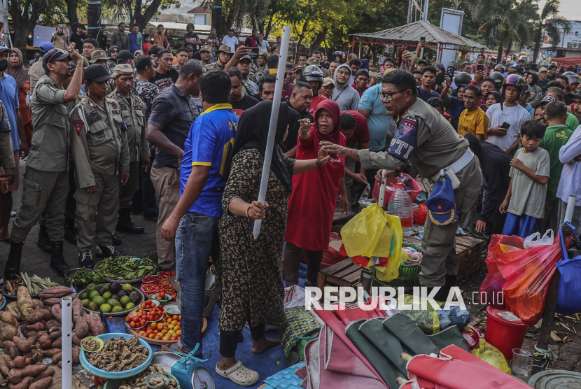 REPUBLIKA.CO.ID, TERNATE -- Seorang pedagang menolak jualannya dipindahkan petugas Disperindag saat penertiban di Pasar Higienis, Ternate, Maluku Utara, Selasa (21/4/2026).