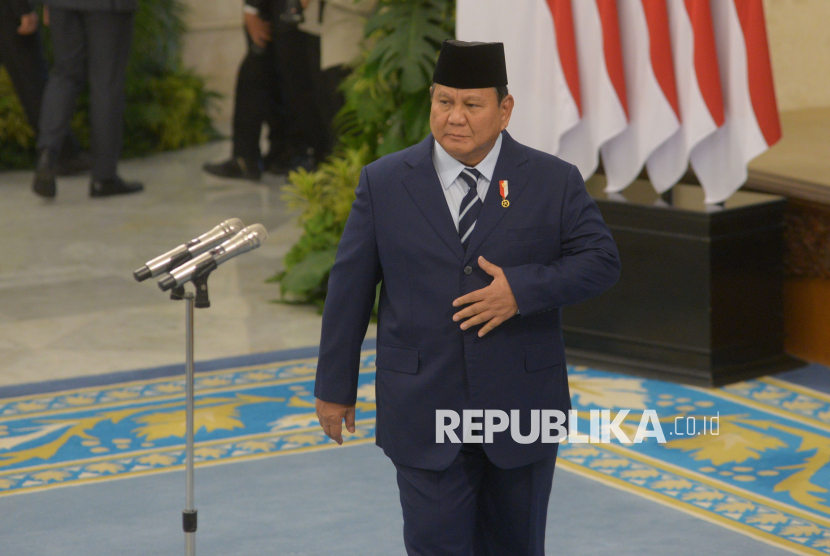 Presiden Prabowo Subianto bersiap mempimpin pelantikan pejabat negara/pemerintah di Istana Negara, Jakarta, Senin (27/4/2026). Presiden Prabowo resmi melantik Jumhur Hidayat menjadi Menteri Lingkungan Hidup/Kepala Badan Pengendalian Lingkungan Hidup, Hanif Faisol menjadi Wakil Menteri Koordinator Bidang Pangan, Dudung Abdurachman menjadi Kepala Staf Kepresidenan, Muhammad Qodari menjadi Kepala Badan Komunikasi Pemerintah, Hasan Nasbi menjadi Penasihat Khusus Presiden Bidang Komunikasi dan Abdul Kadir Karding menjadi Kepala Badan Karantina Indonesia. (FOTO : Republika/Prayogi)