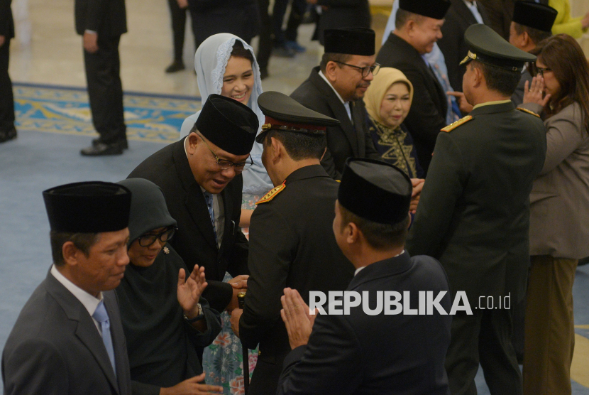 Para undangan memberikan ucapan selamat kepada pejabat negara/pemerintah usai pelantikan di Istana Negara, Jakarta, Senin (27/4/2026). Presiden Prabowo resmi melantik Jumhur Hidayat menjadi Menteri Lingkungan Hidup/Kepala Badan Pengendalian Lingkungan Hidup, Hanif Faisol menjadi Wakil Menteri Koordinator Bidang Pangan, Dudung Abdurachman menjadi Kepala Staf Kepresidenan, Muhammad Qodari menjadi Kepala Badan Komunikasi Pemerintah, Hasan Nasbi menjadi Penasihat Khusus Presiden Bidang Komunikasi dan Abdul Kadir Karding menjadi Kepala Badan Karantina Indonesia. (FOTO : Republika/Prayogi)