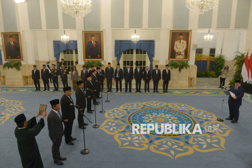 Presiden Prabowo Subianto mempimpin pelantikan pejabat negara/pemerintah di Istana Negara, Jakarta, Senin (27/4/2026). Presiden Prabowo resmi melantik Jumhur Hidayat menjadi Menteri Lingkungan Hidup/Kepala Badan Pengendalian Lingkungan Hidup, Hanif Faisol menjadi Wakil Menteri Koordinator Bidang Pangan, Dudung Abdurachman menjadi Kepala Staf Kepresidenan, Muhammad Qodari menjadi Kepala Badan Komunikasi Pemerintah, Hasan Nasbi menjadi Penasihat Khusus Presiden Bidang Komunikasi dan Abdul Kadir Karding menjadi Kepala Badan Karantina Indonesia. (FOTO : Republika/Prayogi)