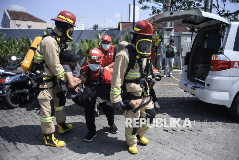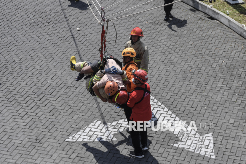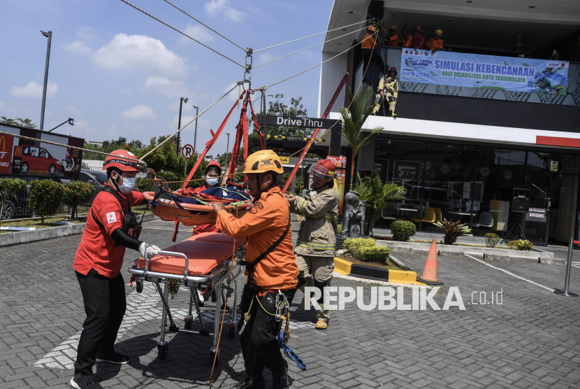 REPUBLIKA.CO.ID, TASIKMALAYA -- Personil Badan Penanggulangan Bencana Daerah (BPBD) dan Pemadam Kebakaran (Damkar) Tasikmalaya mengevakuasi penyandang disabilitas saat simulasi penanggulangan bencana di Tasikmalaya, Jawa Barat, Sabtu (25/4/2026).